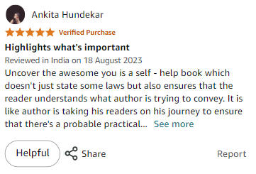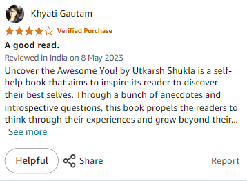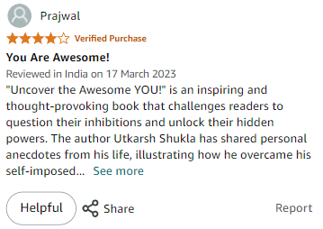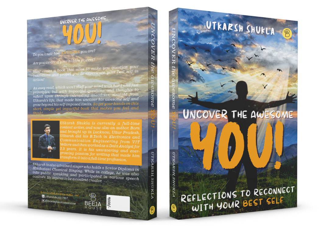 with Utkarsh Shukla's book "Uncover the Awesome YOU!" This easy read is designed to make you reflect on your life, challenge your inhibitions, and help you become the best version of yourself. With impactful quotes, relatable stories, and thought-provoking questions, you'll be guided to uncover your awesomeness and grow beyond your limits.